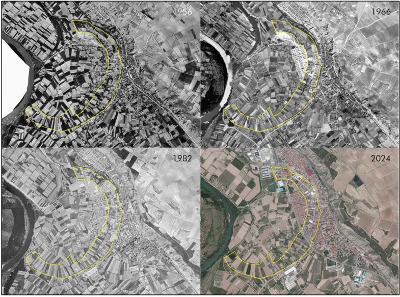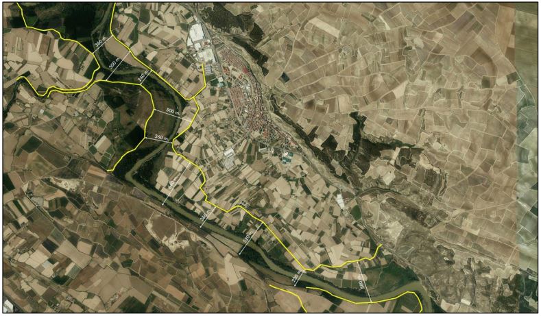 Tras la construcción del nuevo motarrón, la localidad se expande hacia la llanura de inundación (figura 2). En un primer momento, salvando el trazado del antiguo meandro, cuyos terrenos se sitúan a una cota aproximadamente un metro más baja que el casco histórico de la población. Aunque desarrollos urbanísticos posteriores ya urbanizan y construyen en esta zona.