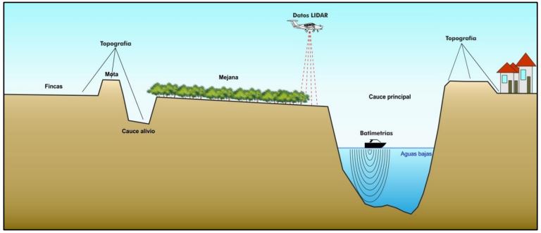 Los métodos anteriores tienen el inconveniente de que no son capaces de obtener datos del terreno que se encuentra debajo del agua. Este ha sido el principal inconveniente que se han encontrado estudios de inundación realizados con anterioridad. Actualmente existe tecnología que permite obtener la topografía del lecho del río de manera continua.