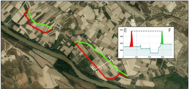 El MDT constata las evidencias detectadas en la observación directa. El motarrón encierra terrenos de baja cota que conducen a la zona urbana que, a su vez, ha crecido urbanizando estos terrenos deprimidos. Las batimetrías muestran que el río Ebro se ha profundizado en todo el tramo como efecto de la canalización. La profundidad media del lecho del río es de 5 metros respecto a la ribera, existiendo grandes pozas de hasta 11 metros de profundidad (ver secciones en figura 8).
