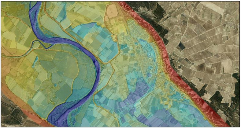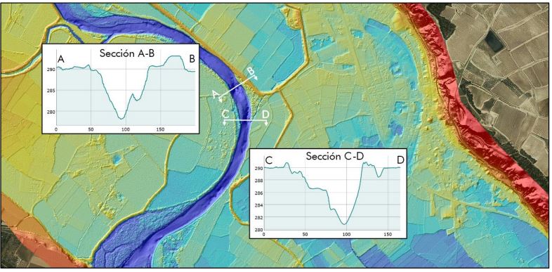 Como novedad para estos estudios realizados en el marco de la Estrategia Ebro Resilience, se han utilizado medios acuáticos dotados de un sonar [6] para la toma de datos batimétricos [7] del lecho del cauce, incorporando estos datos al estudio. Los datos obtenidos se combinan para la elaboración del MDT (figura 8).
