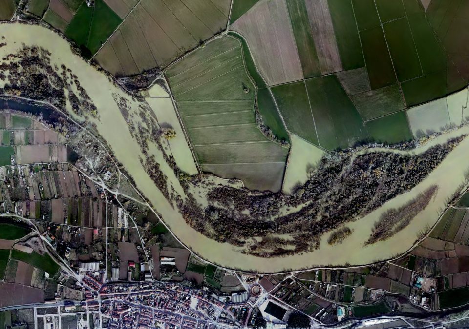 No obstante, la modelización de la situación actual ha puesto de manifiesto que existe una zona urbanizada, denominada “Los Huertos”, que sufre inundaciones para avenidas del entorno de los 2.500 m3/s. Este hecho se ha constatado con las fotografías aéreas de la avenida de 2018. La urbanización se ubica en un antiguo brazo del río, a una cota relativamente baja incluso comparada con los terrenos contiguos.