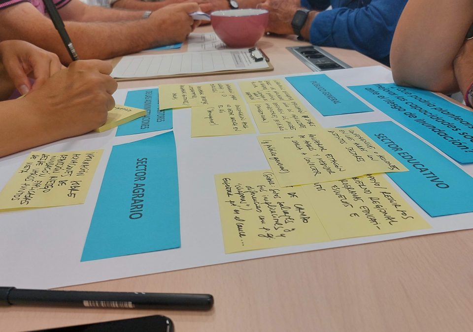 Una vez presentados los datos comienza la parte en la que se deben proponer acciones de mejora de la respuesta de la población ante el riesgo de inundación –capacitación–. Para ello primero se solicita a los asistentes que realicen una reflexión individual sobre qué necesitarían personalmente para mejorar sus capacidades ante el riesgo de inundación y, posteriormente, se propone pasar a un espacio más deliberativo compuesto por tres grupos de trabajo de 5-6 personas dinamizados por personal del equipo de participación del Proyecto. Se plantearon distintos escenarios para la proposición de las acciones: público en general, sector agrario, sector educativo y administraciones.