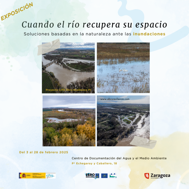 Del 3 al 28 de febrero el Proyecto LIFE Ebro Resilience P1 organiza junto al Centro de Documentación del Agua y Medio Ambiente (CDAMAZ) del Ayuntamiento de Zaragoza, el Paseo Echegaray y Caballero, nº18, la muestra Cuando el río recupera su espacio. Soluciones basadas en la naturaleza ante las inundaciones.