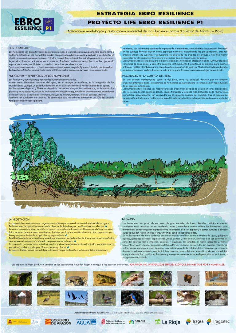 Junto con las fotografías y los vídeos, se incluyen tres paneles divulgativos dedicados a la información general del Proyecto, a la tipología de intervenciones en el recuperado meandro de La Roza, en Alfaro y por último, y coincidiendo la muestra con el Día Mundial de los Humedales, centrado en el papel beneficioso de las zonas húmedas.