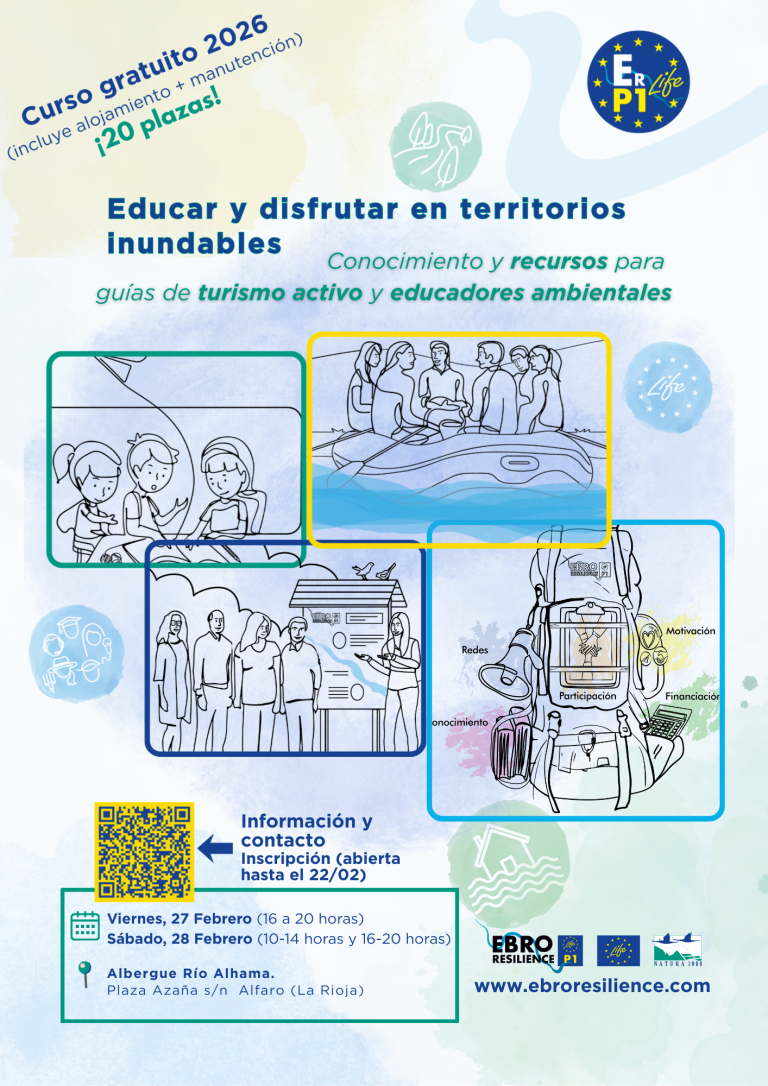 El Proyecto LIFE Ebro Resilience P1 abre la inscripción para el curso “Educar y disfrutar en territorios inundables: conocimiento y recursos para guías de turismo activo y educadores ambientales” dirigido para estos profesionales que estén interesados en integrar la gestión y la percepción del riesgo de inundación y los valores ambientales de los sistemas fluviales en sus actividades.