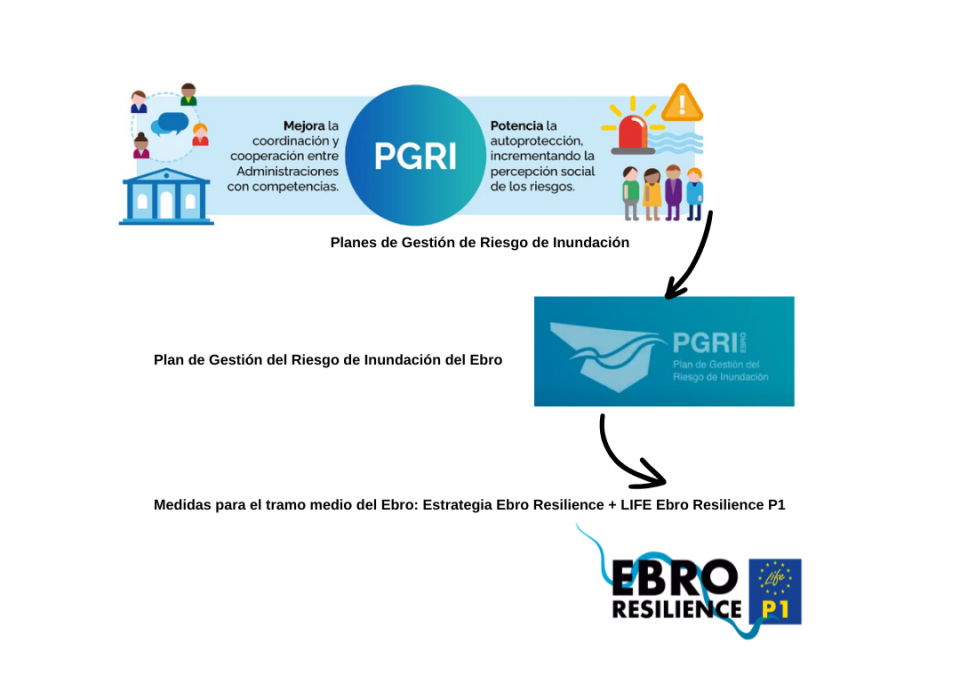 La Estrategia Ebro Resilience y el Proyecto LIFE Ebro Resilience P1 definen la filosofía de intervención y sirven como acción piloto en la implantación del Plan de Gestión del Riesgo de Inundación de la Demarcación del Ebro (PGRIEbro) en toda la cuenca. Estas actuaciones innovadoras destacan por su objetivo de reducción de las afecciones por inundación, pero, también, por la búsqueda de soluciones basadas en la naturaleza y la implementación de infraestructuras verdes.