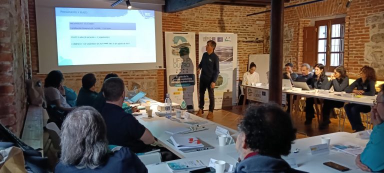 The meeting began with a session to analyze the projects, their objectives, actions and implementation difficulties. It was held at the Don Álvaro de Luna Mill in Azagra, headquarters of LIFE IP Duero after its restoration, with the participation of the technical teams of both.
