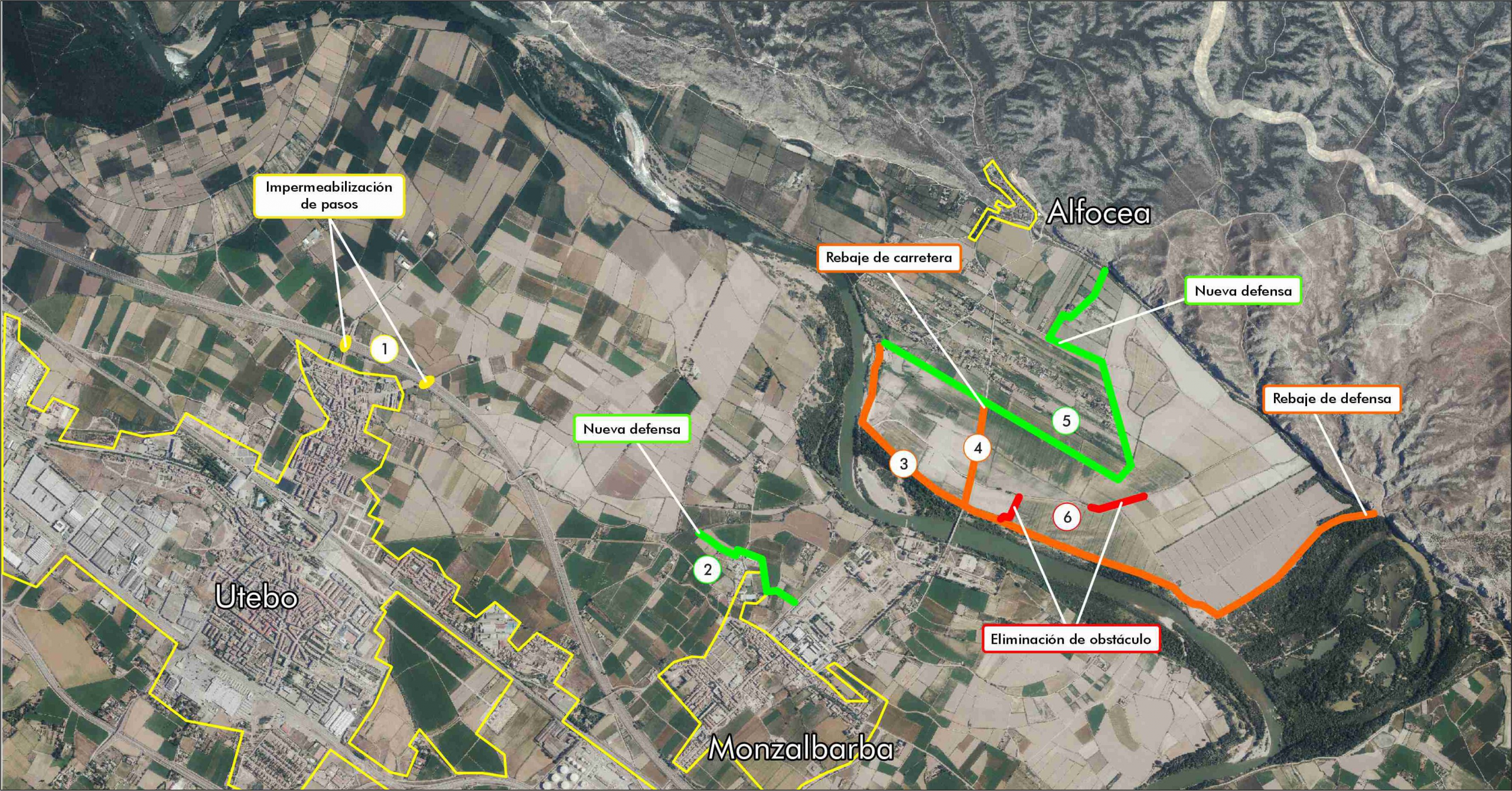 The proposal involves a combination of actions along the entire section that has proven to be the most efficient in preventing flooding of the urban centers of Utebo, Monzalbarba and Alfocea for floods with a return period of 25 years. It also reduces the height of the water in 370 hectares of agricultural land for a 10-year return period flood and improves drainage and water evacuation in the meander of La Almozara.