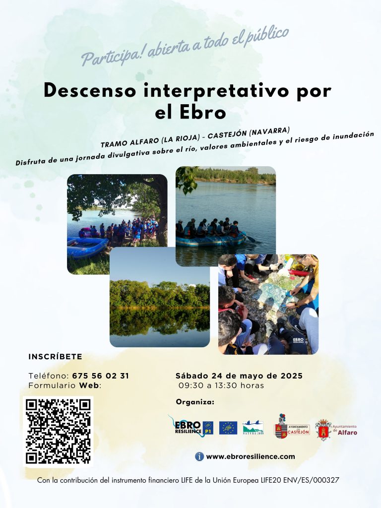 The LIFE Ebro Resilience P1 Project, in collaboration with the municipalities of Alfaro (La Rioja) and Castejón (Navarra), organizes a new activity that combines recreational and informative activities for the riverside population in the middle stretch of the Ebro. On May 24, Saturday, there will be an interpretative descent of the Ebro River between the two towns.