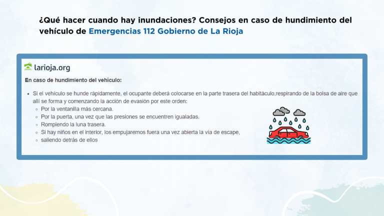 2⃣ El Gobierno de La Rioja – 112 Rioja ofrece recursos sobre distintos tipos de emergencia. Por ejemplo, encontramos en su web una recopilación de recomendaciones sobre cómo actuar si se produce el hundimiento de un vehículo (🖱).