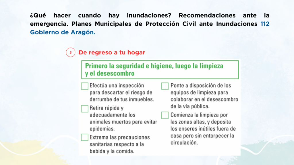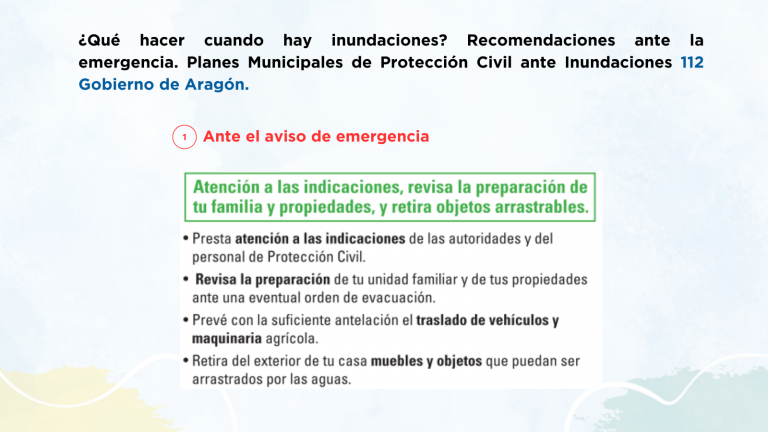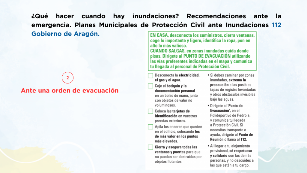 En municipios del tramo medio del Ebro en Aragón puedes encontrar desde una lista de productos que incluir en un kit de emergencia, hasta recomendaciones sobre la vuelta al hogar tras una evacuación, junto con información más específica de cada municipio como los puntos de encuentro o las vías de evacuación.