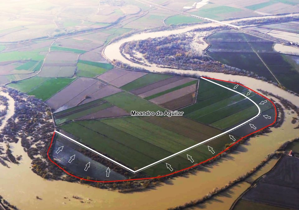 - Retirada de un tramo del dique de defensa actual en el meandro de Aguilar en una longitud de 2.035 metros y construcción de un nuevo tramo de defensa retranqueada en este meandro en una longitud de 1.665 metros.