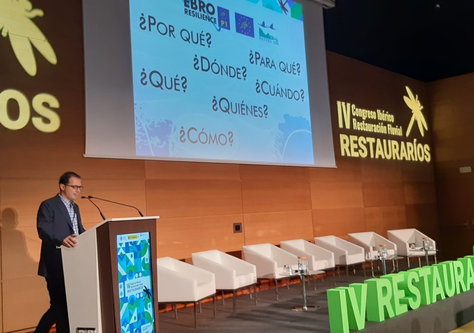El “Proyecto LIFE Ebro Resilience: restauración fluvial y gestión del riesgo de inundación” ha sido uno de los temas de la sesión principal, el plenario del Congreso, a través de la ponencia de David Gargantilla, jefe de Servicio en la Confederación Hidrográfica del Ebro y coordinador técnico del Proyecto LIFE. La propuesta ha compartido espacio con otro Proyecto LIFE, el IP Duero y con las ponencias internacionales dedicadas a los humedales como solución para sequías e inundaciones y a los trabajos de restauración fluvial realizados en Portugal tras los incendios de 2017.
